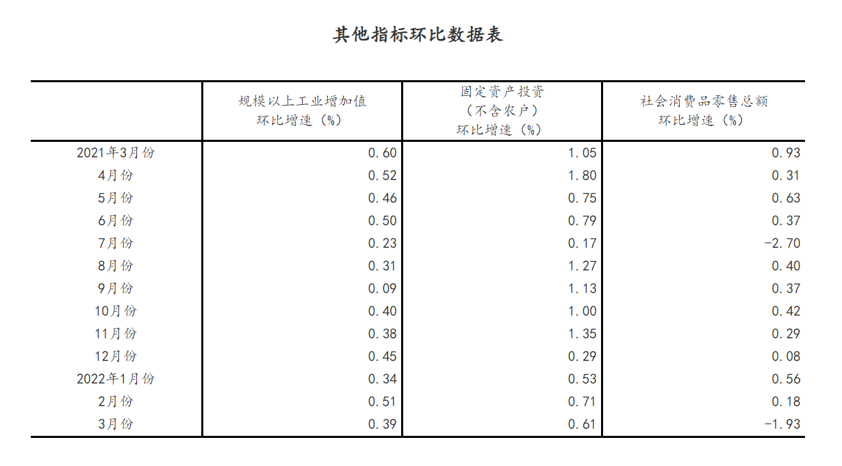 (2)根據(jù)季節(jié)調整模型自動修正結果,對近一年來各期國內生產總值、規(guī)模以上工業(yè)增加值、固定資產投資(不含農戶)、社會消費品零售總額環(huán)比增速進行修訂。修訂結果及2022年一季度GDP環(huán)比數(shù)據(jù)、2022年3月份其他指標環(huán)比數(shù)據(jù)如下: