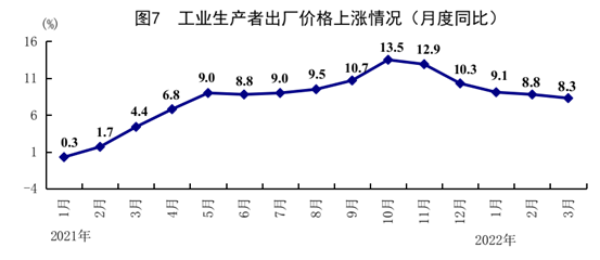 一季度,全國工業(yè)生產者出廠價格同比上漲8.7%。其中,3月份同比上漲8.3%,漲幅比上月回落0.5個百分點;環(huán)比上漲1.1%。一季度,工業(yè)生產者購進價格上漲11.3%。其中,3月份同比上漲10.7%,漲幅比上月回落0.5個百分點;環(huán)比上漲1.3%。