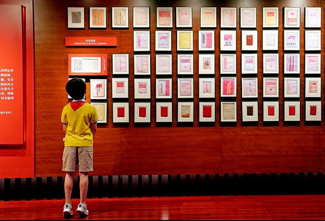 上海中共二大會(huì)址紀(jì)念館黨章歷程廳內(nèi),各個(gè)時(shí)期的珍貴黨章版本鋪滿(mǎn)整整一面墻。圖為一名小學(xué)生在展廳內(nèi)參觀。